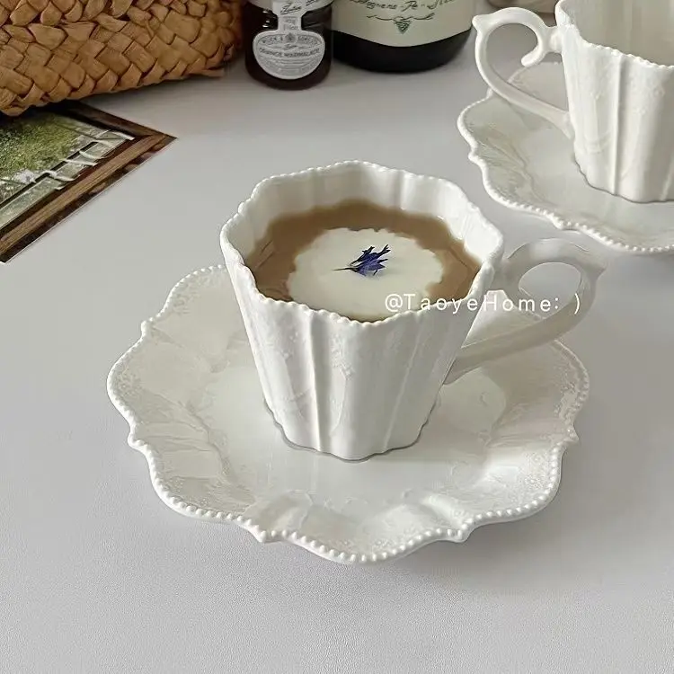 French Antique Relief Lace Ceramic Coffee Cup Saucer Latte Cup Afternoon Tea High Appearance Level Middle Age Gift  Read more