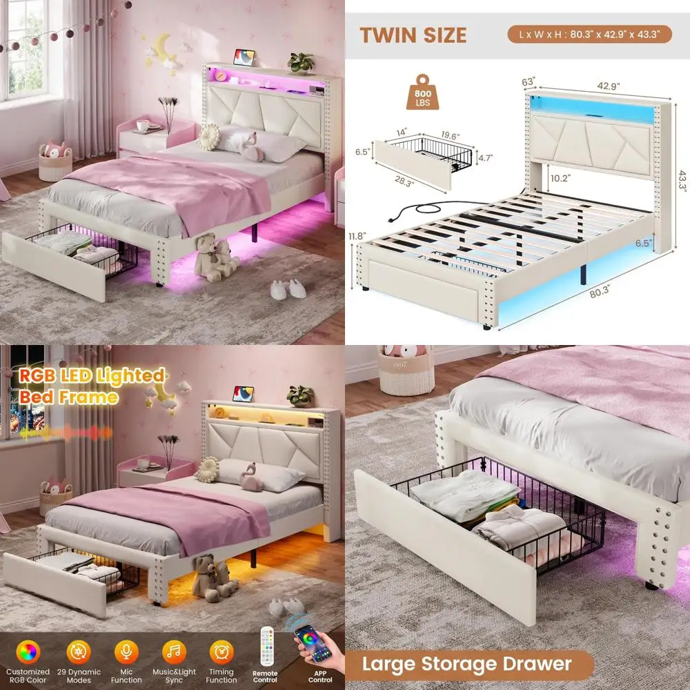 VIAGDO White Twin Bed Frames with LED Lights, Upholstered Platform Bed Frame Twin Size with Storage Headboard and Charging Stati  Read more