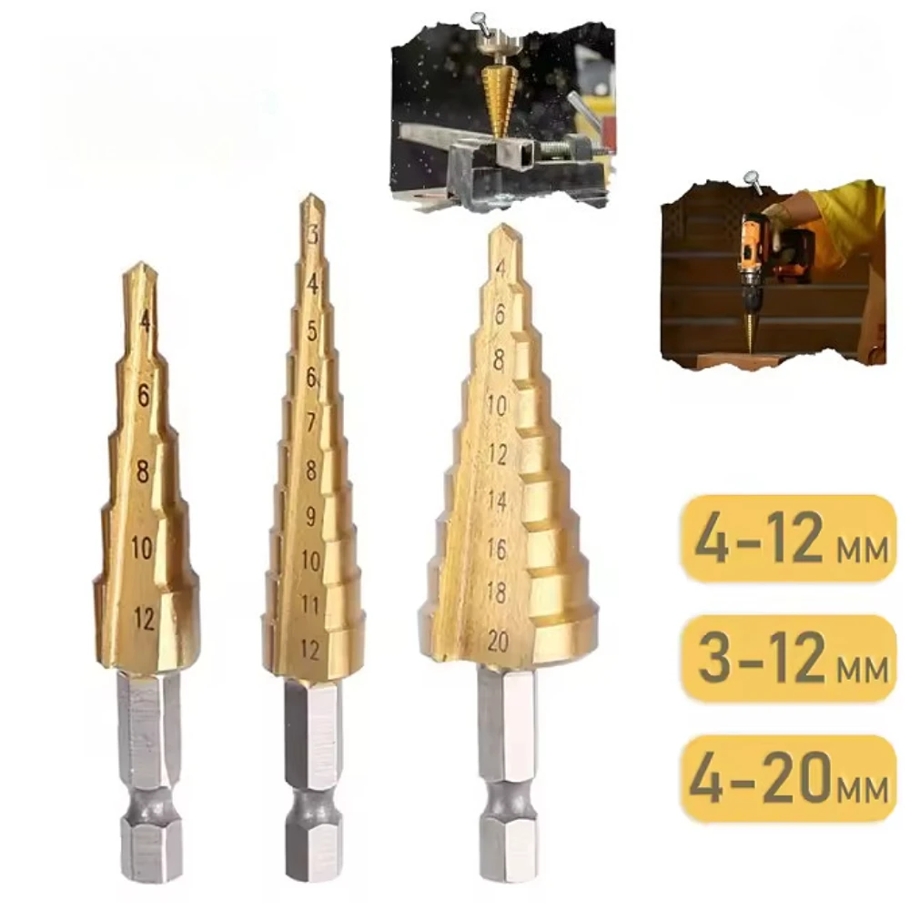 3-PCS Titanium Coated HSS Step Awl Set - Gold Finish, High-Speed ​​Steel for Drilling Wood and Metal, Suitable for Crafts
