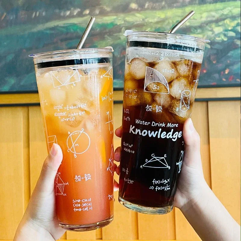 1000ml Large Capacity Mathematical Pattern Clear Glass Cup Utensils Cup With Lid And Stainless Steel Straw Milk Juice Coffee Mug