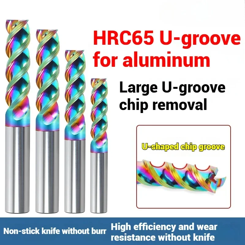 HRC65 DLC Color Coated High Gloss Aluminum Milling Cutter Special CNC U-groove Integral Tungsten Steel 3 Flute Carbide End Mill