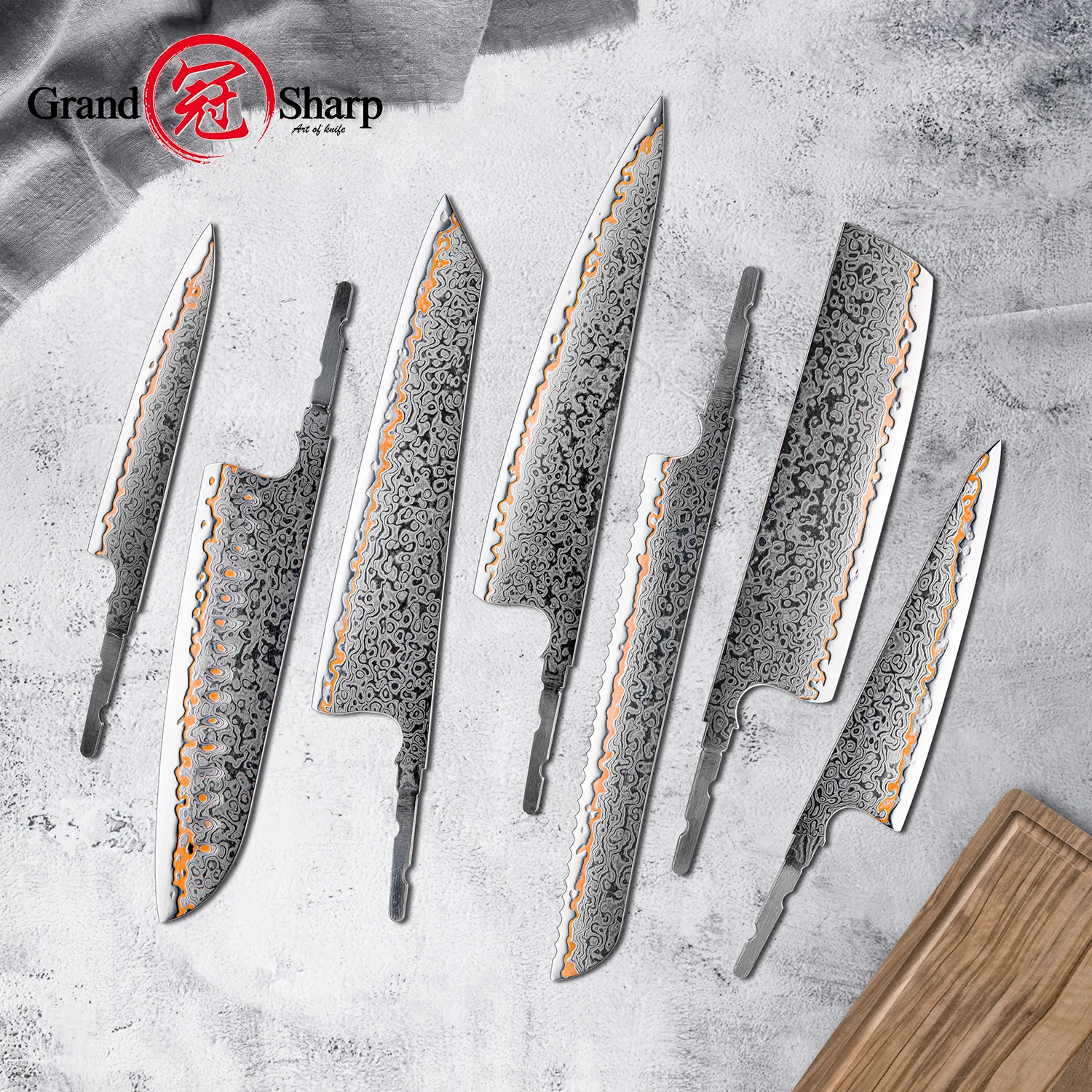 Grandsharp Damascus Blades 1-7PCS Kit 55 Layers Copper Damascus Steel No Handle DIY Knife Making Forging Blades Custom Tool
