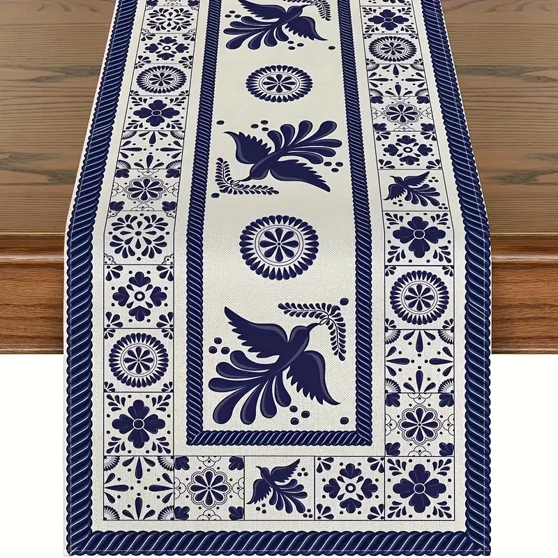 1 Piece of Mexican-Style Flower and Bird Table Runner, Painted with Dark Blue Traditional Patterns on a White Background, and Bird Patterns, Suitable for Mexican Restaurants, Folk Culture Exhibitions,