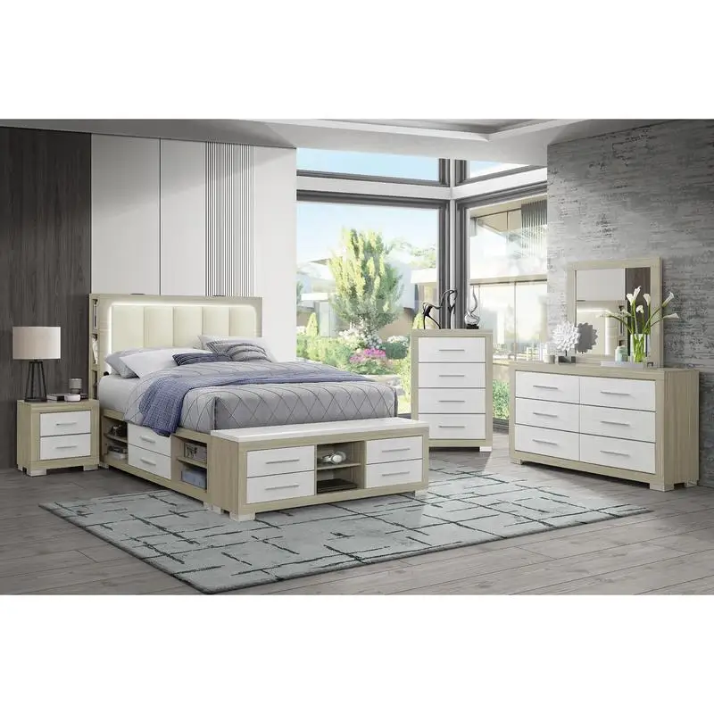 Natural White Full Bedroom Set 5 Pieces - Modern Design for Cozy Spaces, Includes Bed Frame, Nightstands, Dresser and Mirror