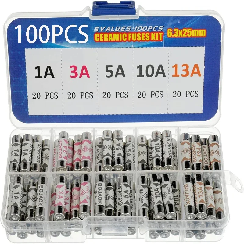 100pcs/boxed 6x25mm Ceramic Fuse 1A 3A 5A 10A 13A British Plug Fuse Insurance Fast Blow Tube Fuses Assortment Kit