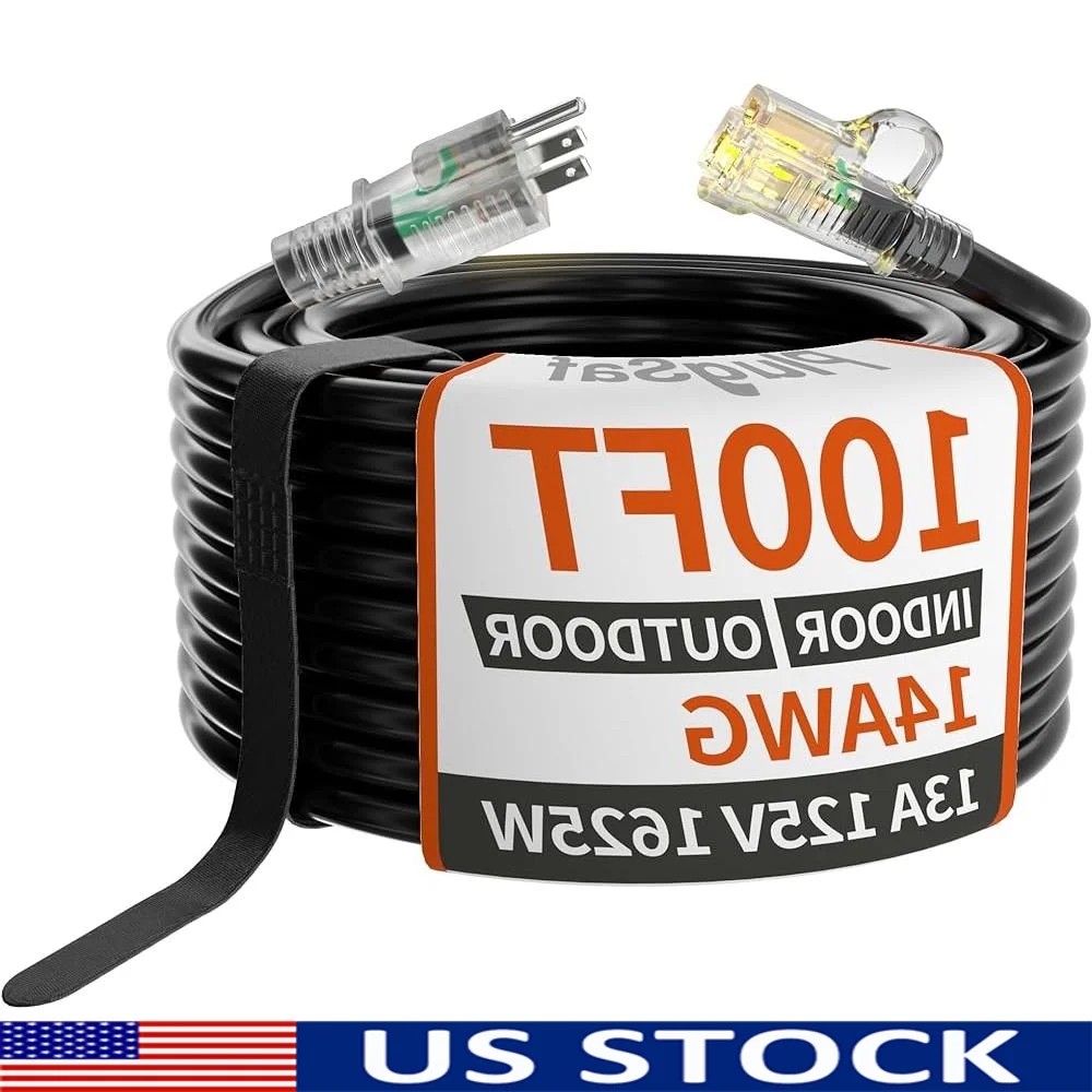 100ft 14/3 Gauge Black Extension Cord Outdoor Waterproof Lighted Indicator Cold Weather -40°C Flexible 3 Prong 125V 13A
