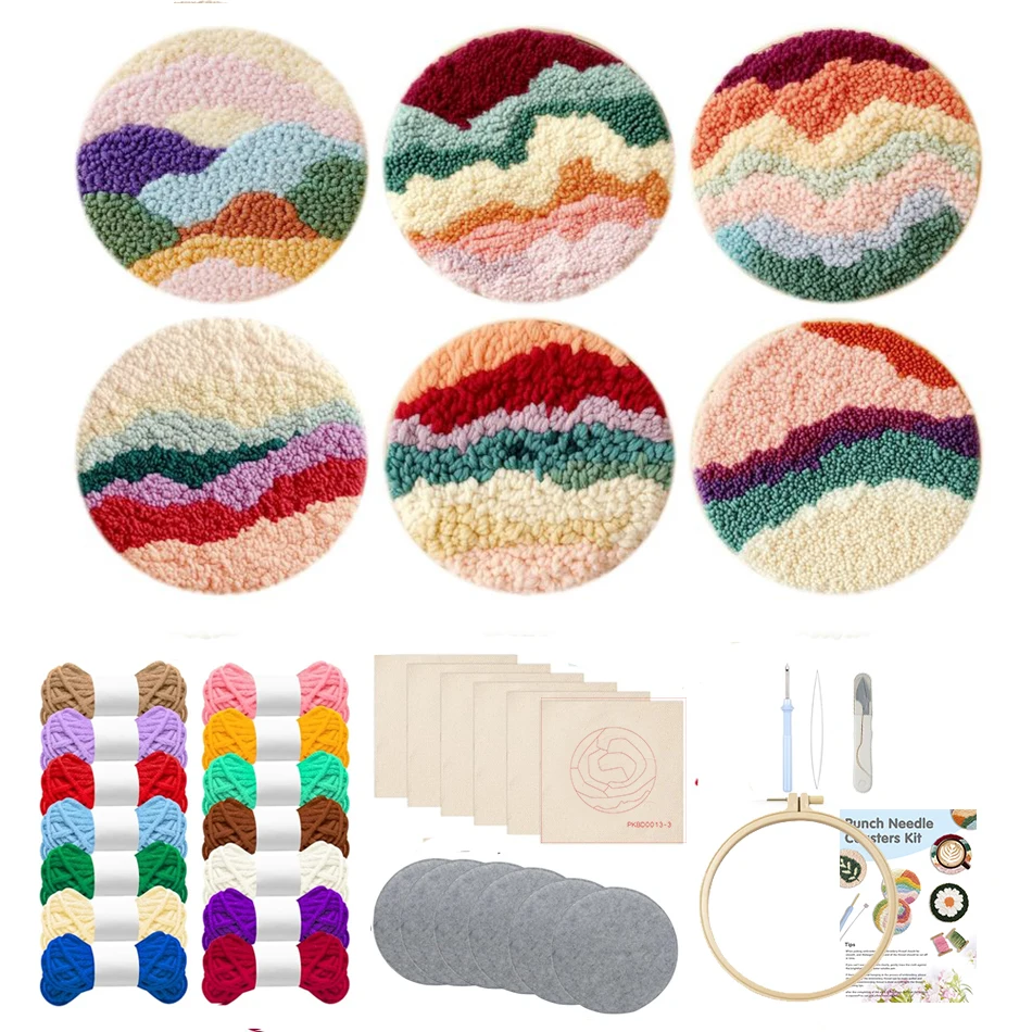 6pcs Landscape Handmade Crochet Table Place Mat Pad Cloth Cup Punch Needle Kit for Beginners Adults Tool Threader Fabric Hoop Y