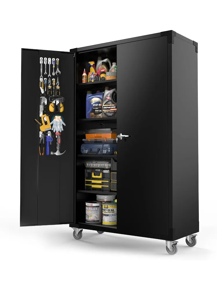 Upgraded Wide & Deep Garage Storage Cabinet, Metal Storage Cabinet with Pegboards, Wheels, Locking Doors and Adjustable S