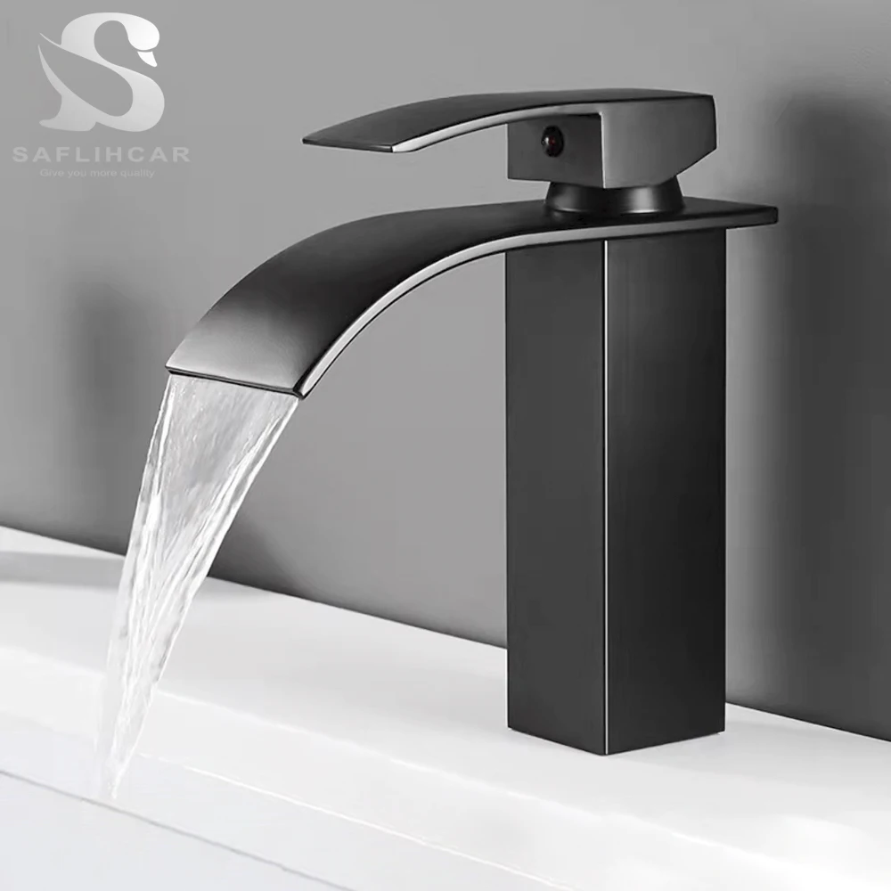 Bathroom Black Waterfall Basin Sink Faucet Brass Cold Hot Water Mixer Vanity Tap Deck Mounted Washbasin Tap