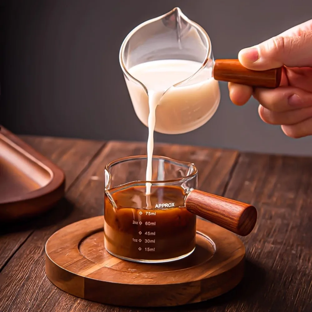 Wood Handle Glass Espresso Cup with Extraction Measuring Cup, Marked Milk Jug, Western-style Sauce Ladle
