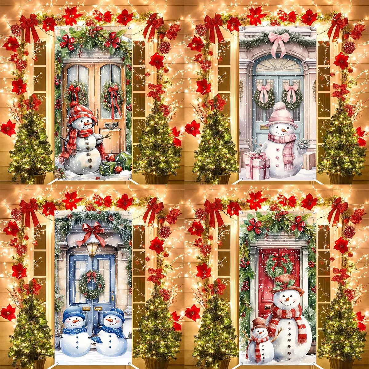 2D flat door banner, oversized Christmas door decoration with winter fairyland scene - giant snowman, Santa Claus, reindeer
