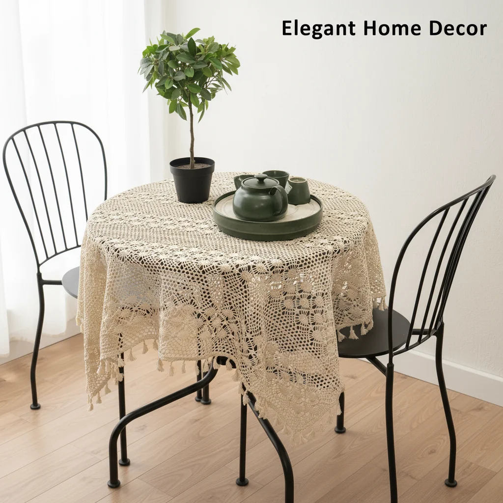 Handmade Crochet Tablecloth Bohemian with Tassels, 100% Natural Cotton Eco-Friendly for Dining Room