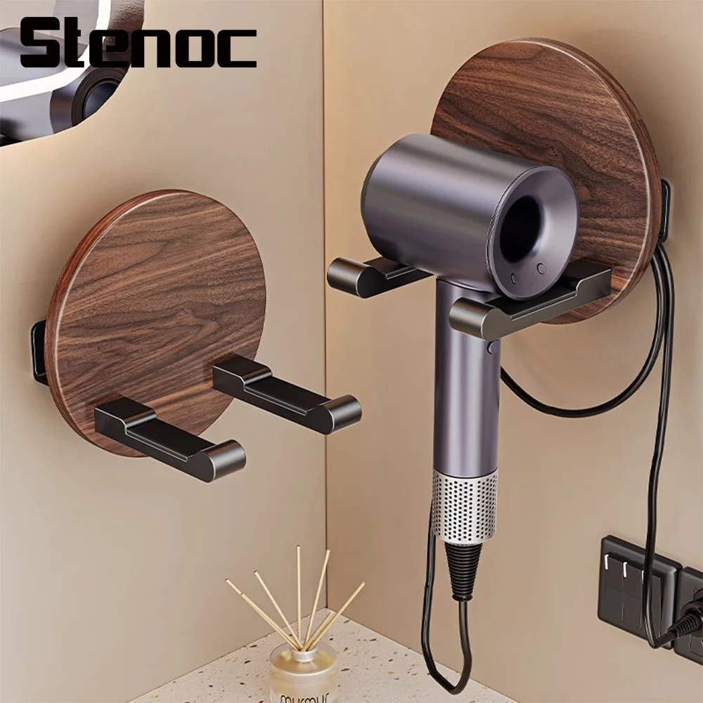 Stenoc Home Black Wall-Mounted No Punching Toilet Hair Dryer Walnut Holder Bathroom Organizer Storage Rack Shelf Accessories