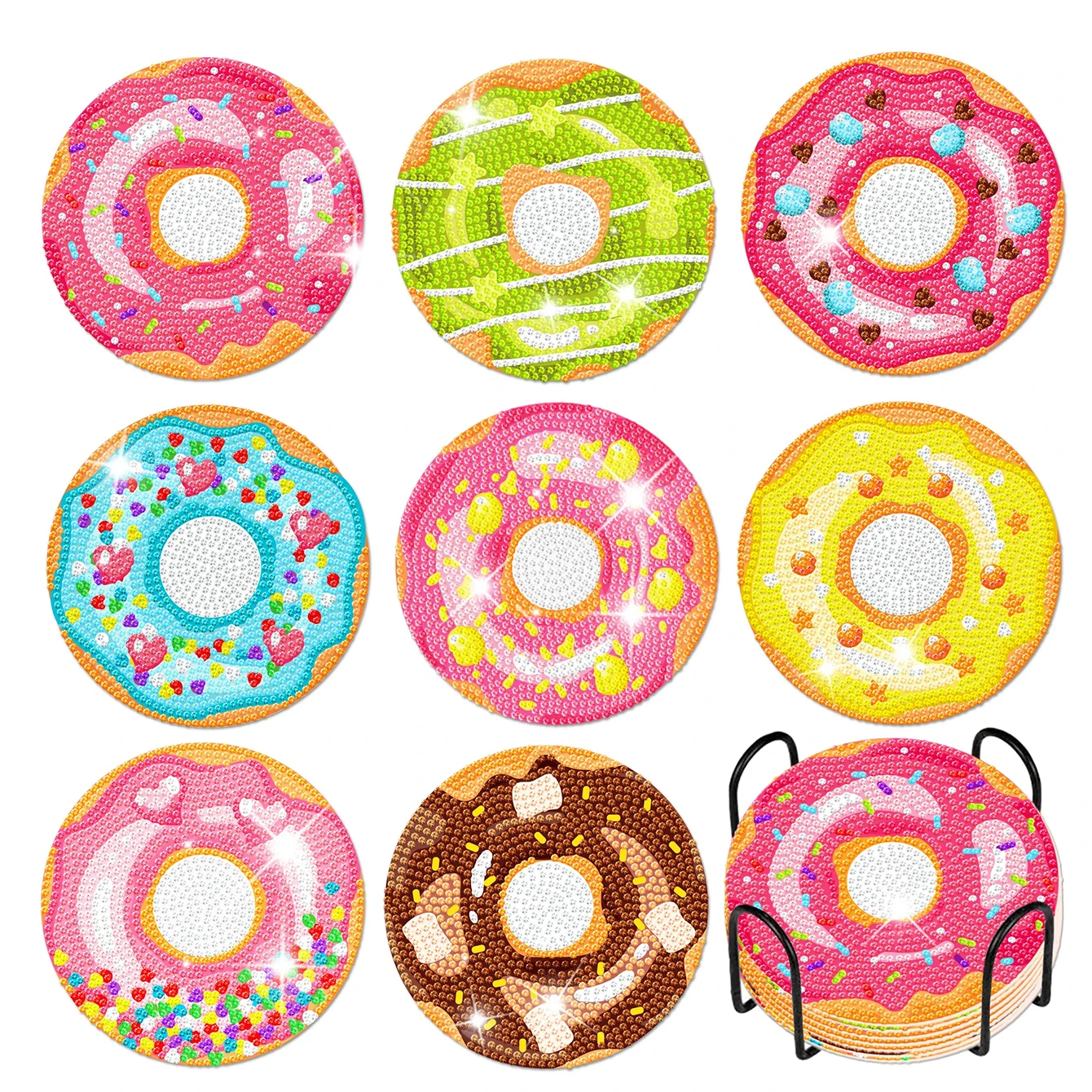 8 pieces/set of donut diamond painting coaster set, DIY coaster with holder for beginners and adults, diamond craft gift