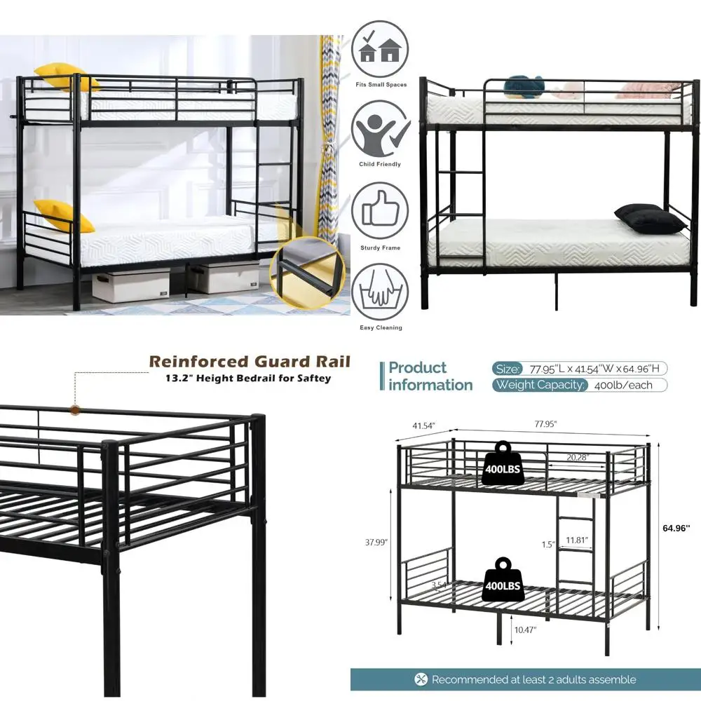 twin over twin heavy duty bunk bed with flat ladder and 13" high guardrail for kids, teens, and adults