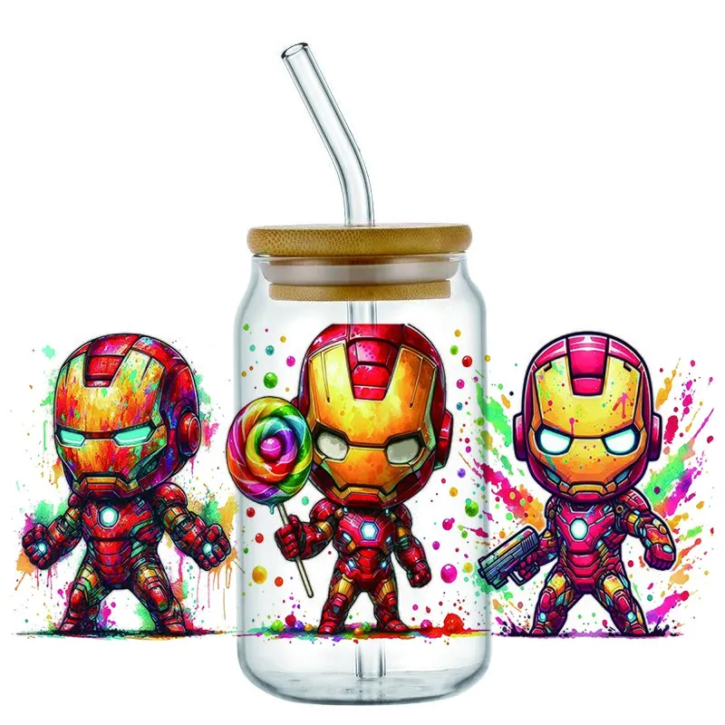 Miniso Cartoon Iron Man and Heroes UV DTF Cup Wraps Transfer Sticker For 16OZ Glass Libbey Can Bottle Selfadhesive Washable