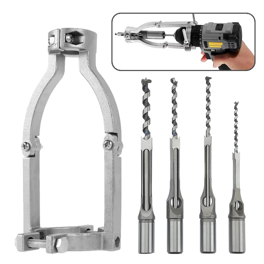 Square Hole Drill Bit Adapter Carbide Square Hole Drill Wiht Fixing Bracket Woodworking Mortising Chisel Kit for Bench Drill