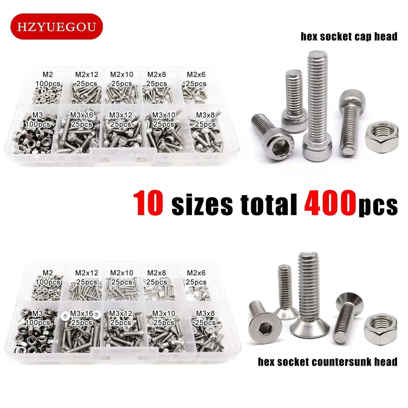 400pcs M2 M3 10 Sizes Allen Hexagon Hex Socket Head Cap Flat Countersunk Screw Bolt Nut Set Mix Kit Box 304 A2 Stainless Steel