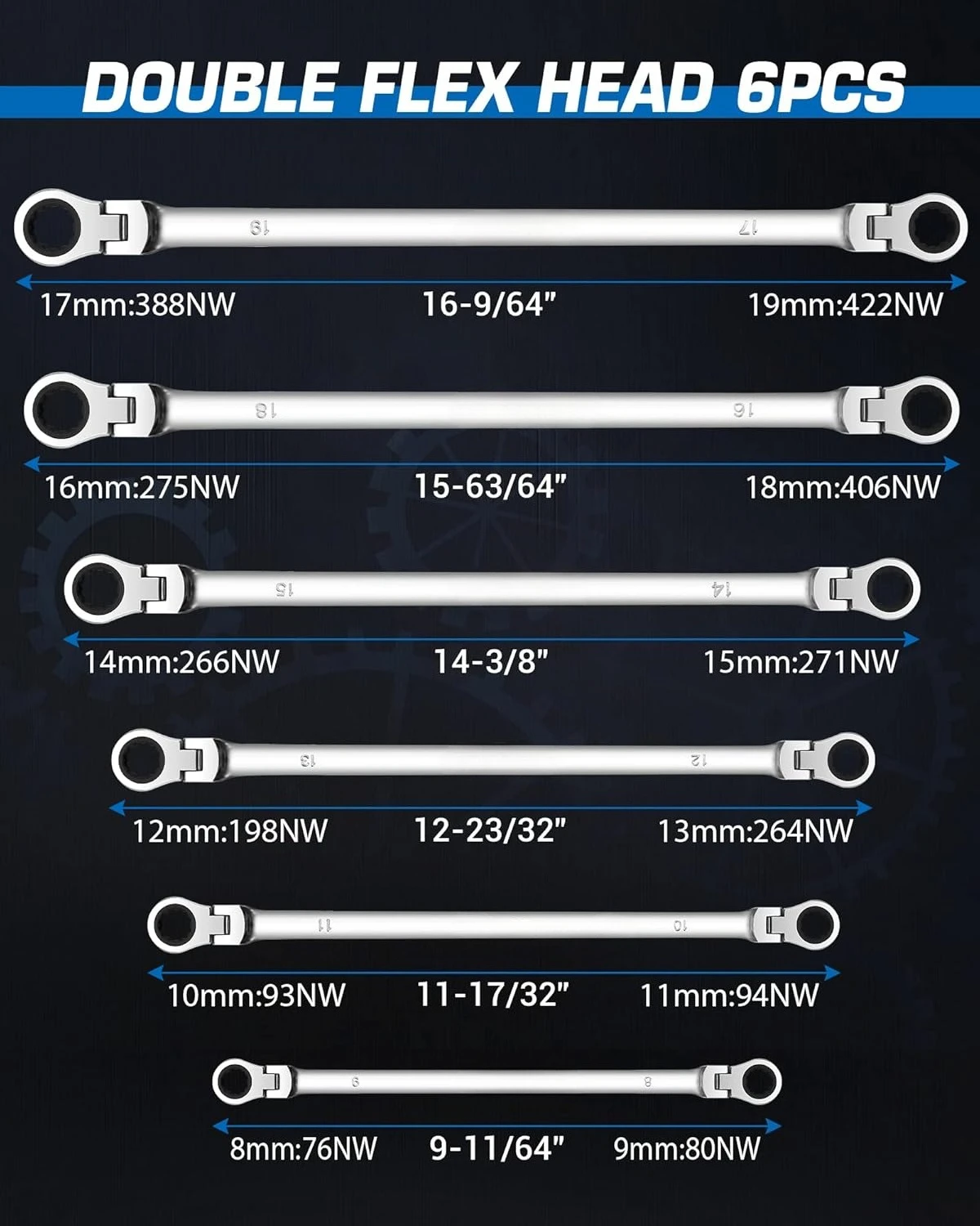 Extra Long Flex Head Ratcheting Wrench set, 6Pcs Double Box End Long Reach Ratchet Wrench Set Metric 8-19mm, CRV Steel  Read more