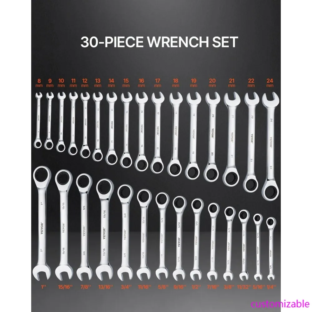 30-Piece Ratcheting Wrench Set with Organizer, Cr-V Steel, SAE 1/4 to 1 and Metric 8mm