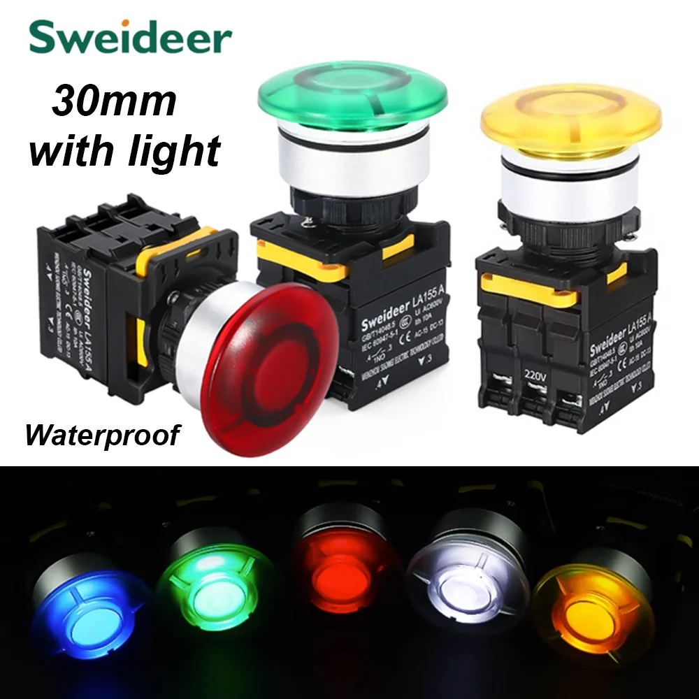 30mm Mushroom Button Switch with Light Waterproof Momentary Reset Self Locking Power Push Button Switch 12V 24V 220V 1NO 1NC Red  Read more