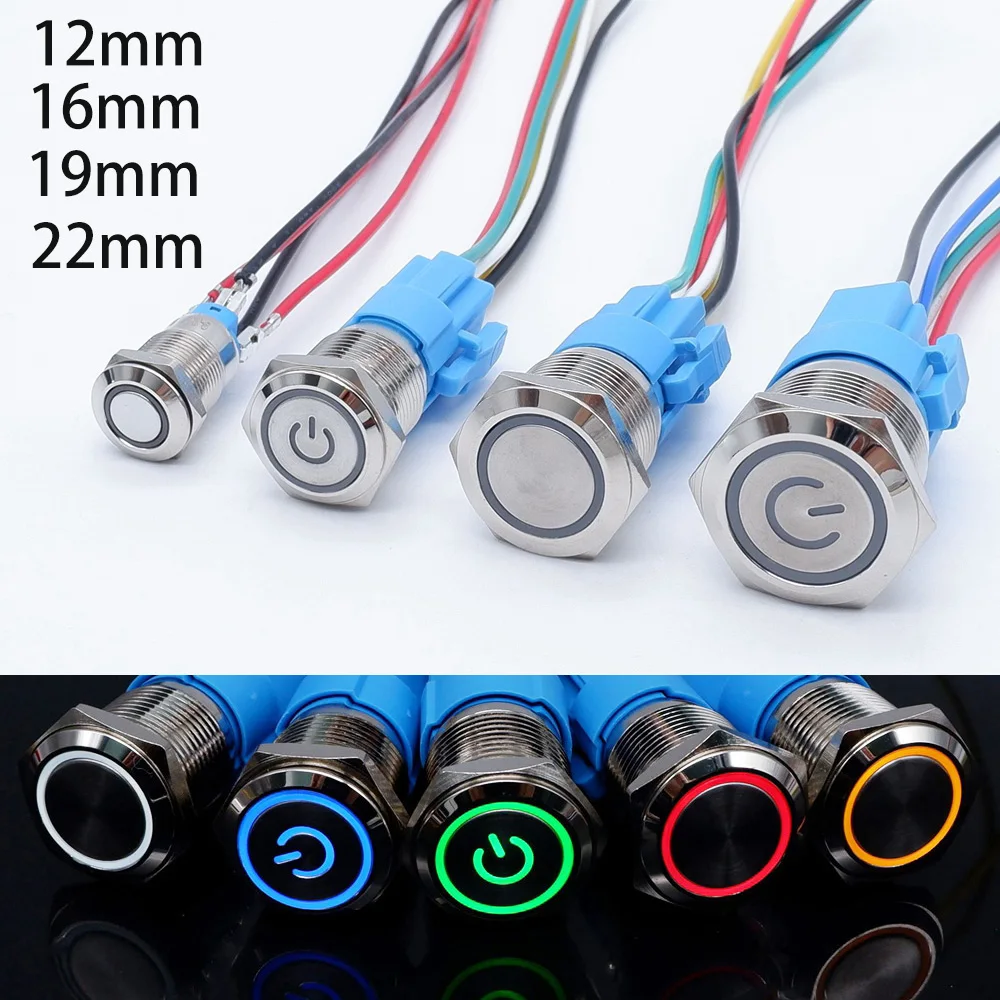 12/16/19/22mm Metal Push Button Switch on off PC Power Flat Head with Wire for Car Momentary Latching Fixed 5V 12v 24v 220V