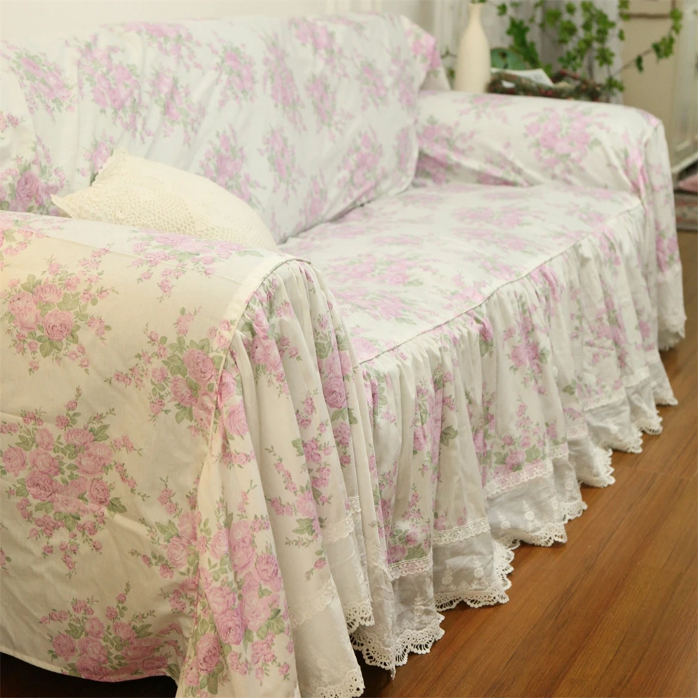Cotton Home Sofa Cover Flower Print Romantic Lace Living Room Sofa Cover Cloth Dustproof Pink Sofa Cover With Skirt