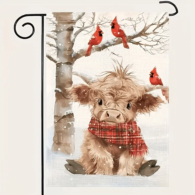 [12x18 inch Double-Sided Garden Flag] 1 Welcome Winter Garden Flag 12x18 inch, double-sided linen Light Snow Highland Calf Garde