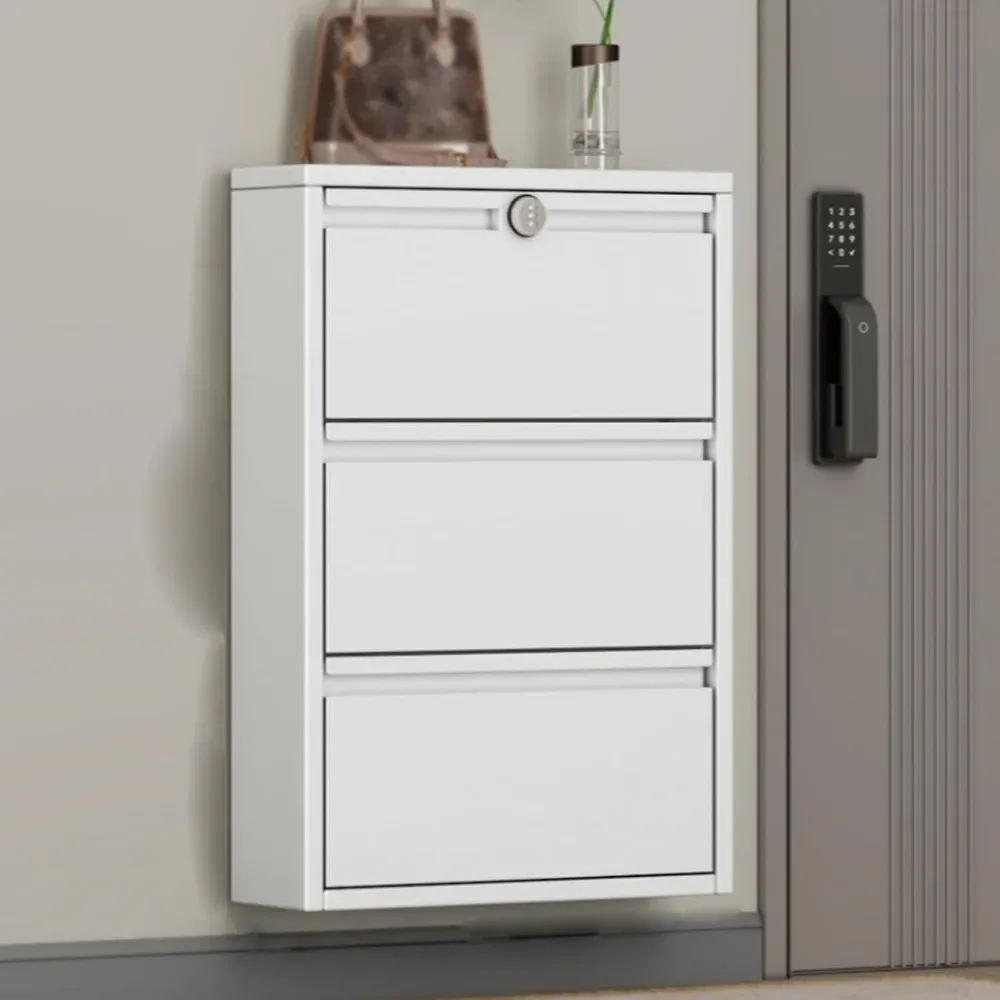 Lockable Metal Shoe Cabinet Wall Mounted 3-Tier Flip Rack No Assembly Narrow Organizer for Apartment