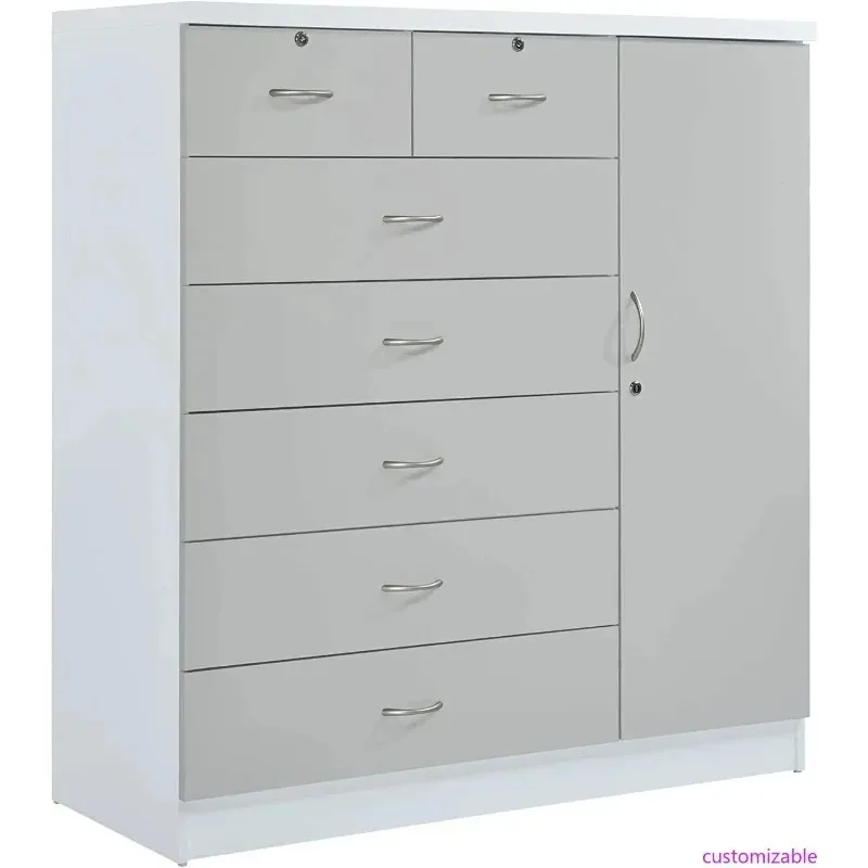 Hodedah 7-Drawer Large Chest with 5 Big Drawers, 2 Small Drawers, Locks, Hanging Rod, and 3 Shelves in Grey-White
