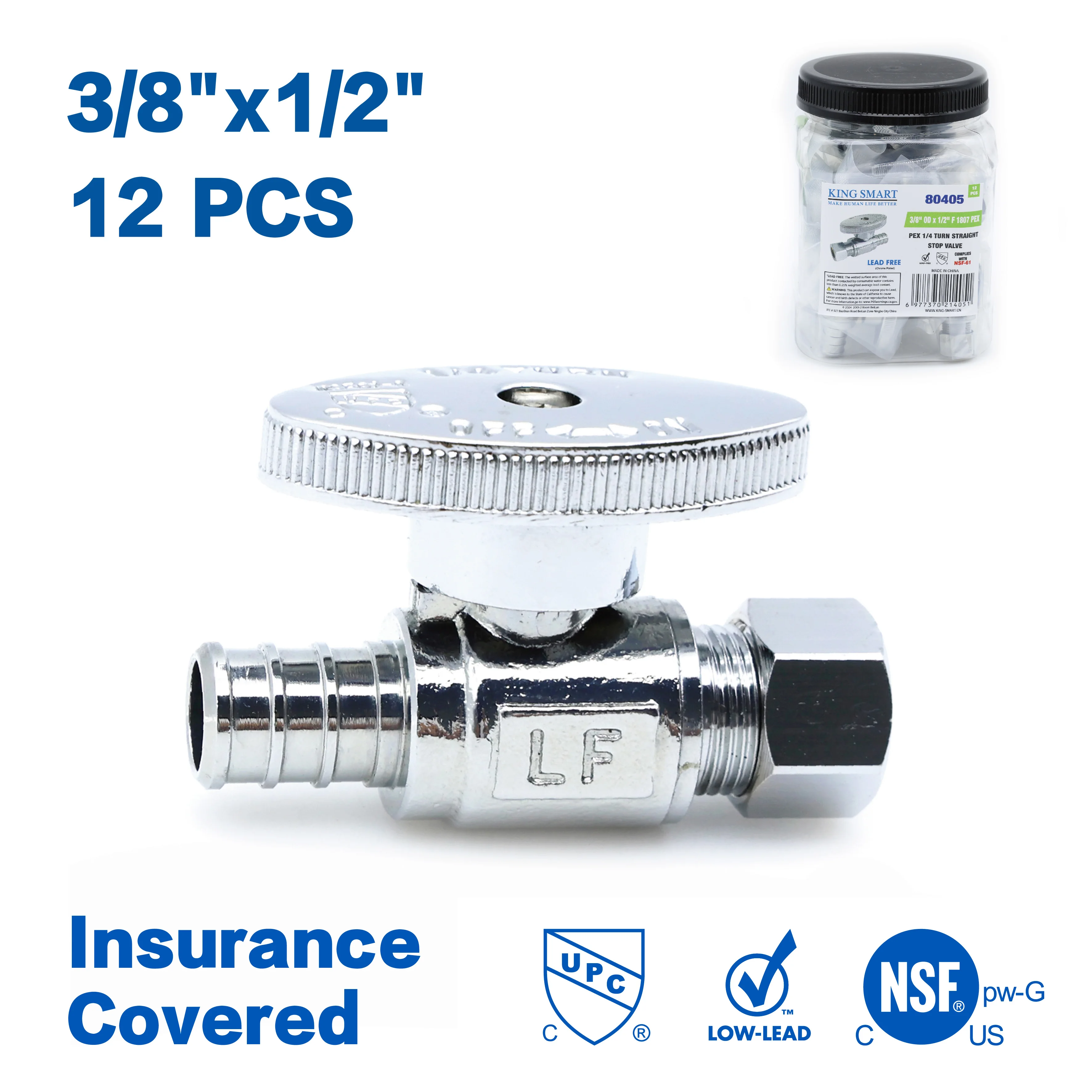 KING SMART Crimp/F1807 PEX 1/2" * 3/8" Comp. OD 1/4 Turn Straight Stop Valve; 12Pcs/Case; 80405