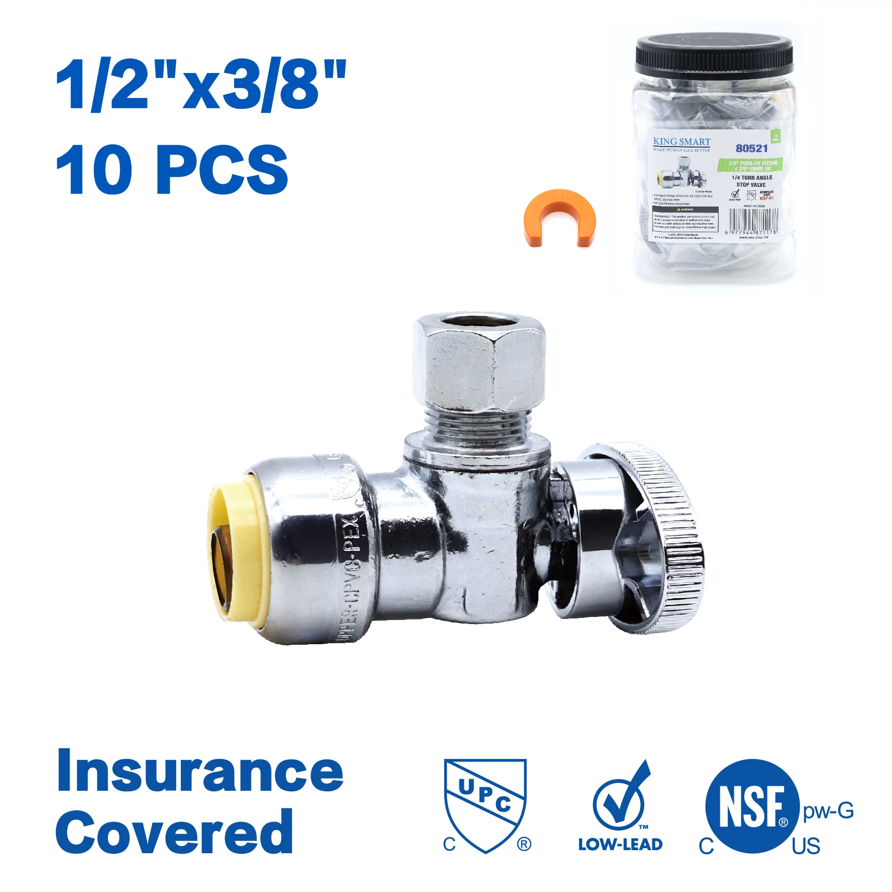 KING SMART 1/2" push fit * 3/8" Comp. OD 1/4 Turn Angle Stop Valve; For PEX Pipe, PERT, CPVC, Copper Pipe; 10Pcs/Case; 80521