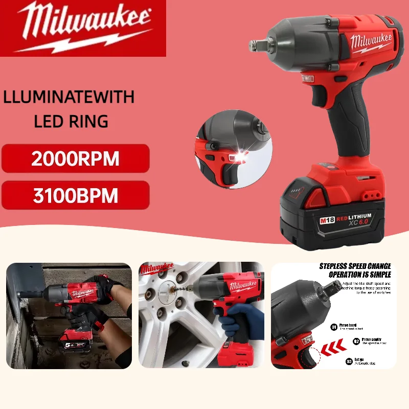 Milwaukee 18V 1300NM Cordless Electric WrenchLarge Torque Brushless Impact Wrench Car Truck Repair Power Tools