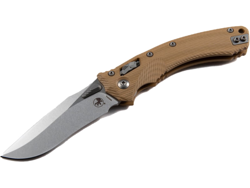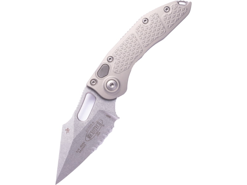 Microtech Stitch Auto S/E Stonewash Part Serrate 3.75in Folding Knife Natural Clear 169-11NC. This model features a substantial choil and thumb ramp spear point style blade and a knurled alloy handle with a black finish. Most of their Stitch Auto...  Read more