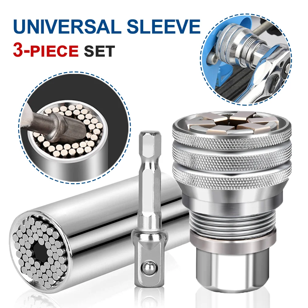 3Pcs Universal Sleeve Set All-Fitting Multi Drill Attachment Adjustable Hex Universal Socket 3/8" Drive Wrench Repair Tools