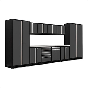 This NewAge Products garage cabinet storage set is designed with sturdy 18-gauge steel frames and 19-gauge double-wall drawer fronts, complemented by a stainless steel work surface.