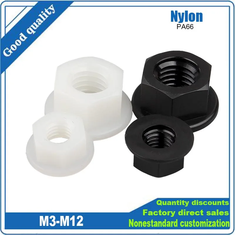 10/50pcs M3 M4 M5 M6 M8 M10 M12 Black White Flat Bottom PA66 Plastic Nylon Insulation Hexagonal Hex Head Flange Nut DIN6923  Read more