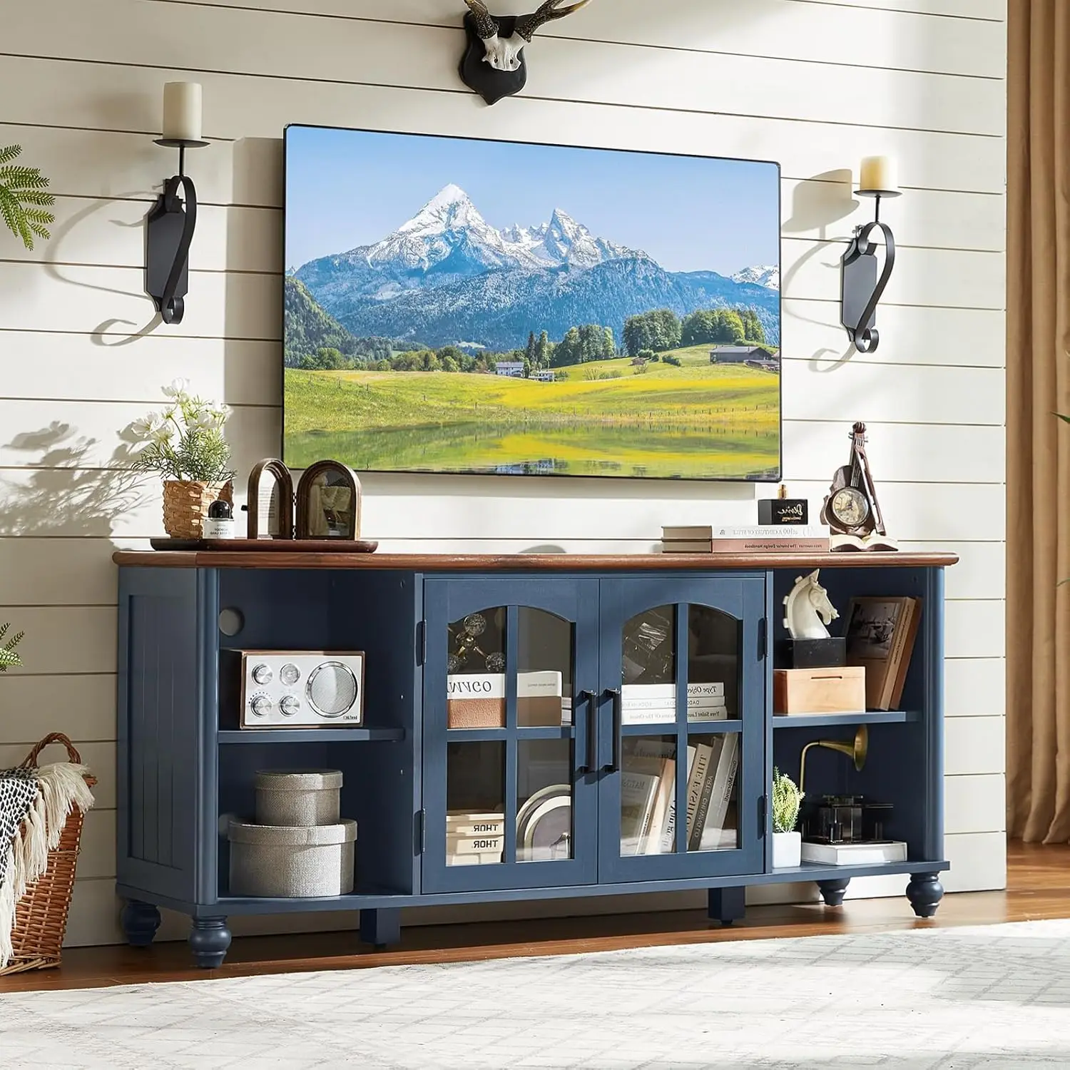 Farmhouse TV Stand for TVs Up to 65-in, Classic Media Entertainment Center w/Glass Door Cabinets & Adjustable Shelves
