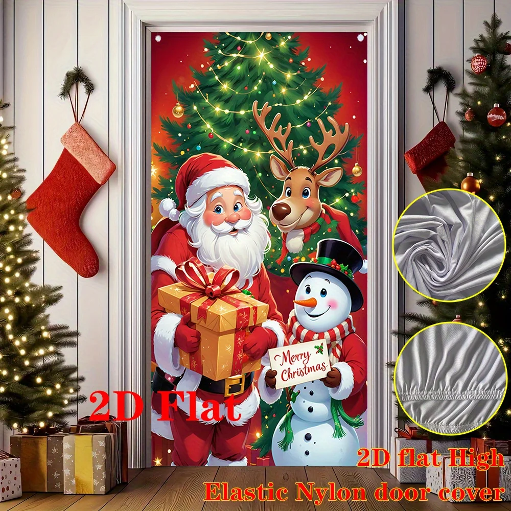 2D flat, 1 festive Christmas door cover - Santa Claus and snowman reindeer tree design, easy to hang, durable polyester
