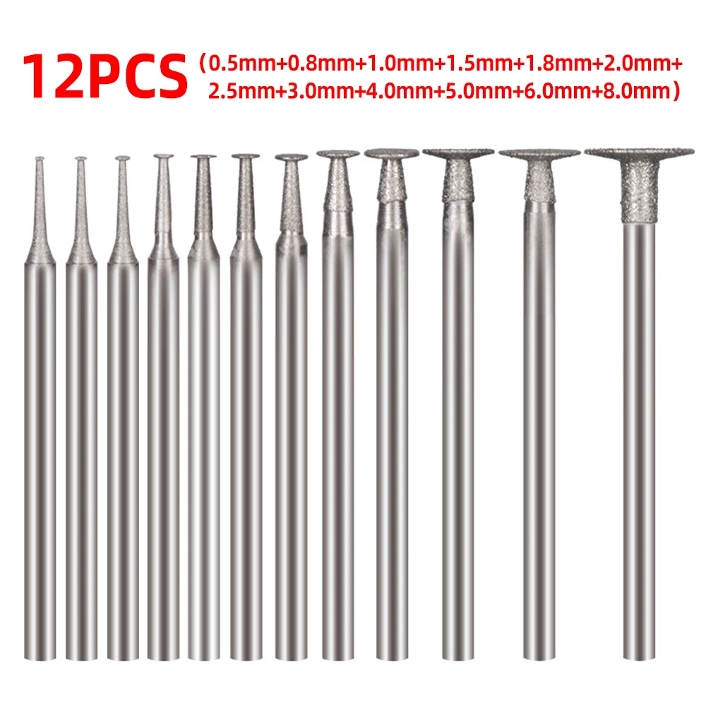 12PCS 2.35mm Grinding Bit Accessory Ultra-Thin T Head Shank Diamond Mounted Point Stone Jade Carve Polish Engrave Tools Set