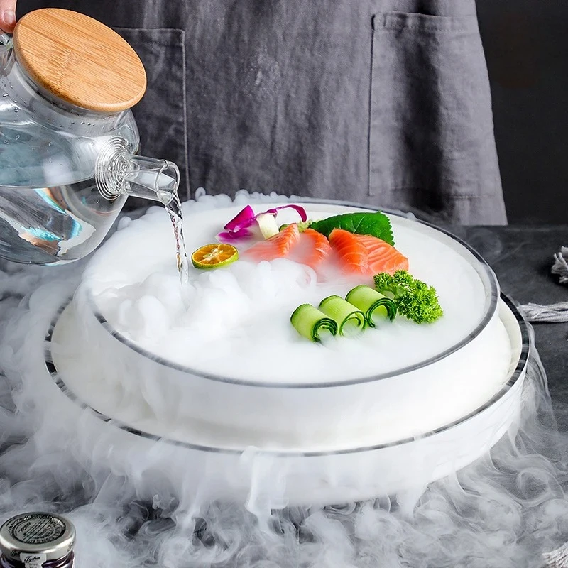 Creative Dry Ice Smoke Container Ceramic Cold Dish Tray Sashimi Dry Ice Plate Tableware Sushi Pan Characteristic Hotel Tableware  Read more