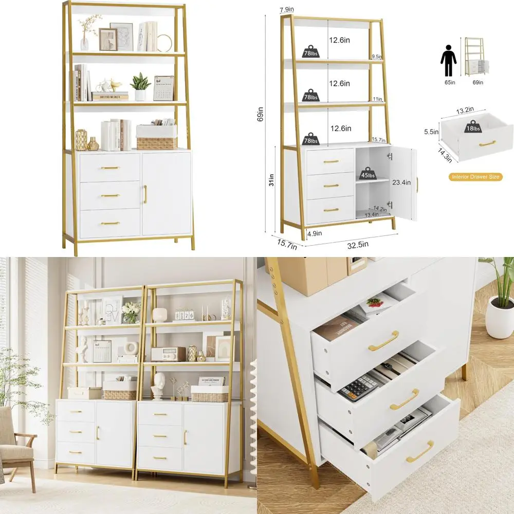 4-Tier White Gold Tall Bookshelf with Wooden Drawers and Ladder Shelves, Freestanding Kitchen Storage Cabinet  Read more