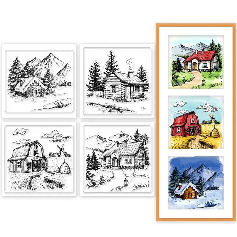 4Pcs Mini Cabin Clear Stamps for DIY Scrapbooking Mini Farm House Landscape Silicone Clear Stamp Seals Transparent Stamps
