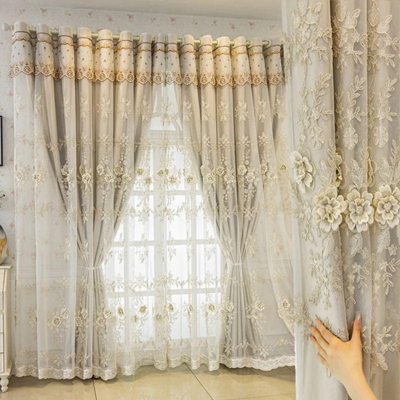 European Palace Luxury Curtains for Living Room Valance Grey Curtains Double Layer Relief Embroidered Tulle Blackout Curtains