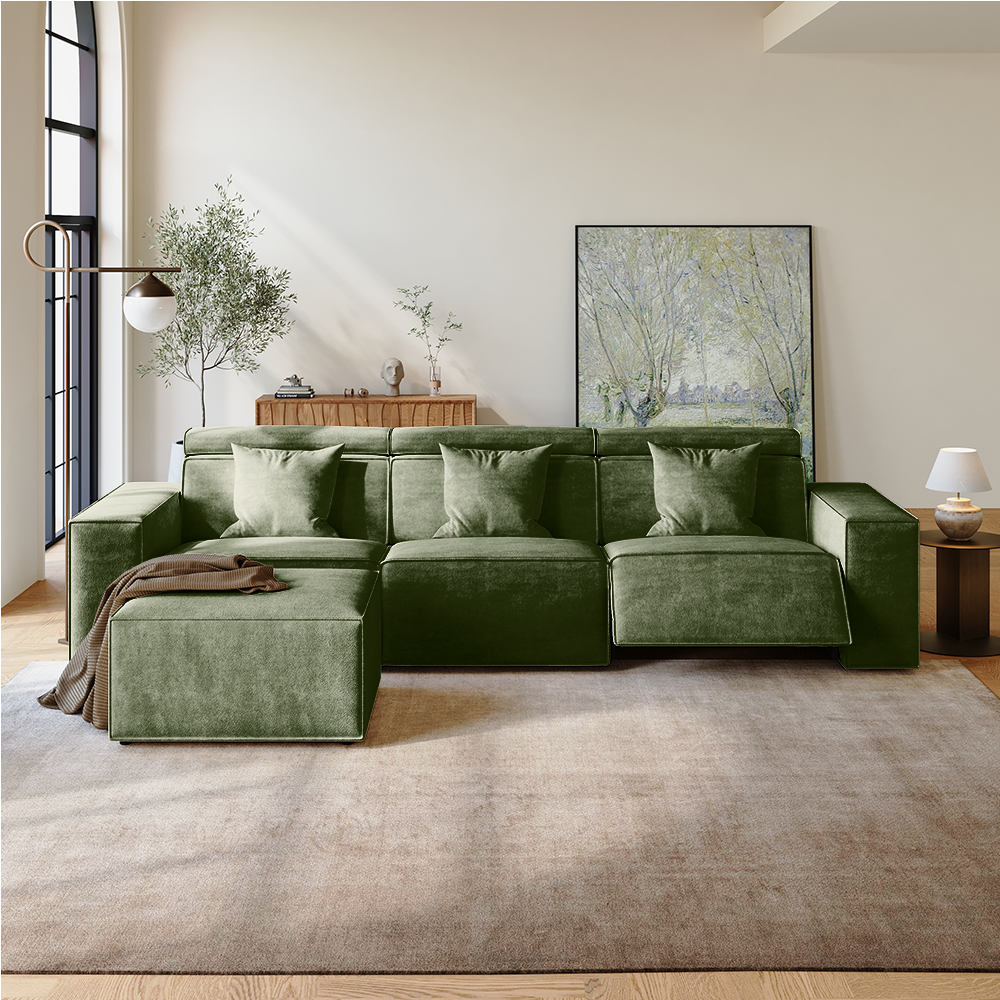 114.67"Minimalist Power Recliner Couch with Ottoman, 2 Recliners, Water Repellent, Scratch Resistant, Dark Green