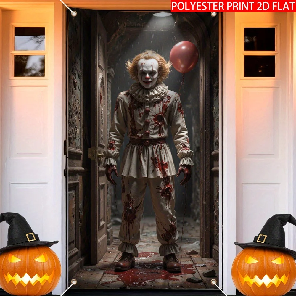 2D door curtain banner, 1 piece Halloween horror clown bloody wizard hat design front door wall window decoration