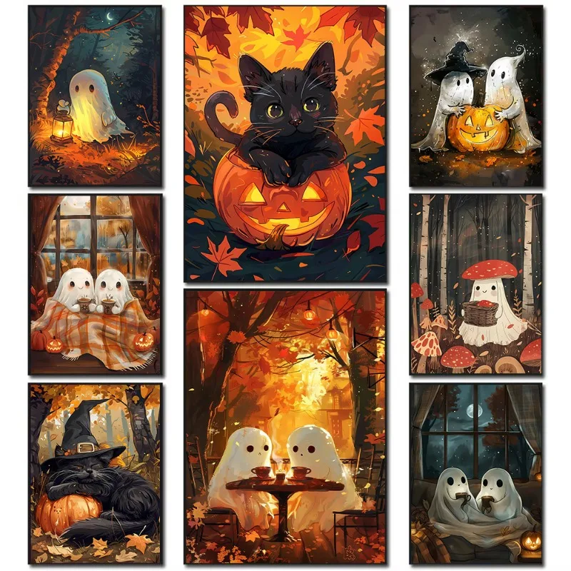 Halloween Canvas Wall Art Spooky Black Cat Pumpkin Ghost Lantern Print for Living Room Porch Decor Vintage Autumn Gothic Gift