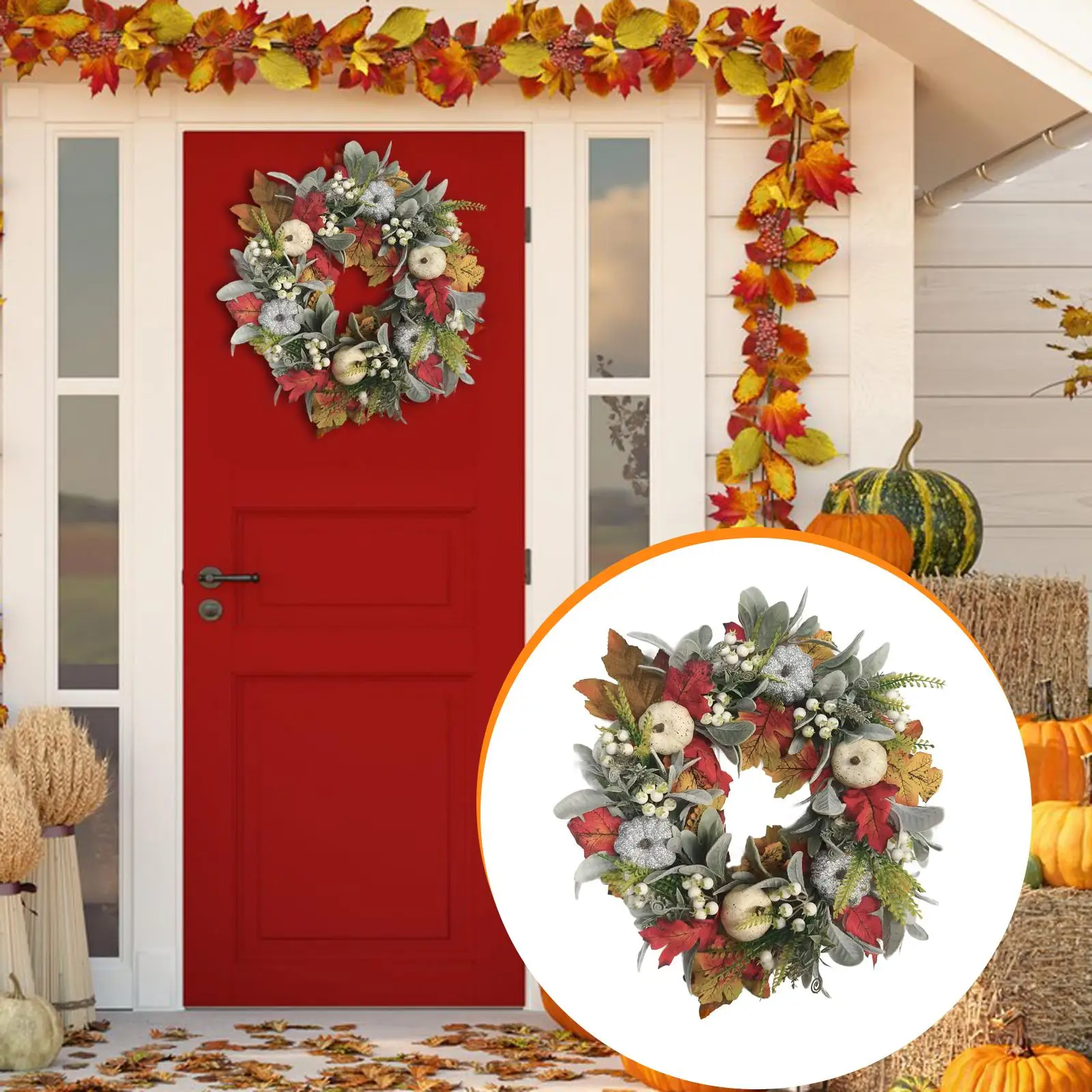 Harvest Wreath Fall Decor Handcrafted Orange Pumpkin Maple Leaf Thanksgiving DIY Home Wedding Party Holiday Front Door Accent