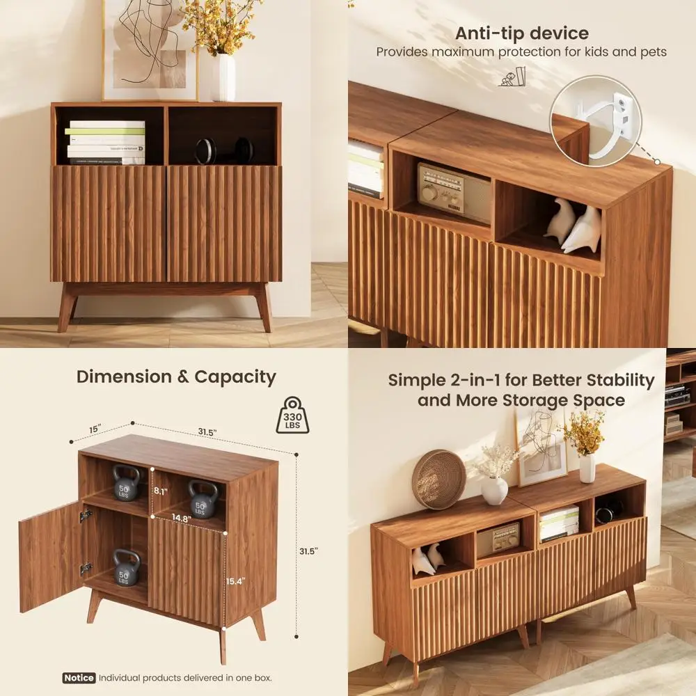 Walnut Fluted Storage Cabinet with Modern Buffet Sideboard, Featuring Doors, Shelves, and Solid Wood Legs