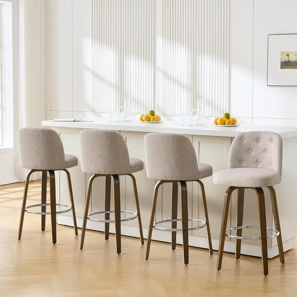 Set of 4 Bar Stools 29" Bar Height Swivel with Back Walnut Bent Wood Legs Linen Fabric Upholstered Modern Kitchen Bar Stool